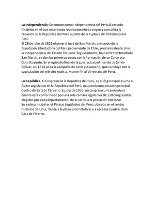 Los primeros habitantes del Perú fueron cazadores nómadas que vivían en cavernas hace 4,000 años a.C. Culturas más avanzadas como Chavín introdujeron la agricultura, la pesca y la religión. Después de la desaparición de Chavín alrededor del 300 a.C., surgieron otras culturas importantes como Nazca, Paracas y Wari. En 1532, los incas fueron conquistados por los españoles dirigidos por Francisco Pizarro, quien ejecutó al emperador inca Atahualpa. En