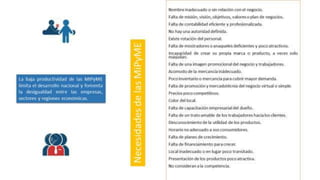 El documento identifica los factores clave de las MiPyME exitosas en México, como tener valores y cultura empresarial, realizar estudios de mercado constantemente, analizar la competencia, crear un ambiente que propicie la innovación, y establecer la misión y visión. También discute cómo las MiPyME necesitan profesionalizarse mediante el desarrollo de habilidades gerenciales para crecer de manera sostenible en el mercado globalizado.