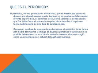 El documento resume la historia del periódico desde sus orígenes. Julio César en el año 59 a.C. en Roma ordenó la publicación diaria de los eventos del gobierno, lo que se considera el precursor del periódico moderno. El primer periódico impreso fue en Alemania a finales del siglo XV. En el siglo XIX, la máquina de linotipo permitió la producción masiva de periódicos. En la actualidad existen también periódicos electrónicos en internet.