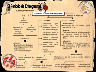 Este documento resume el período de entreguerras de 1919 a 1929, incluyendo la crisis posguerra, el periodo de crecimiento en los "felices años veinte", y la Gran Depresión causada por el colapso de la bolsa en 1929. Describe las causas económicas, sociales y políticas de cada período, así como las consecuencias a nivel mundial de la crisis y las soluciones implementadas por diferentes países.