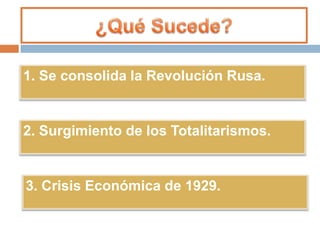 1) La Revolución Rusa de 1917 llevó al derrocamiento del régimen zarista y al establecimiento del primer estado socialista bajo el liderazgo de Lenin y los bolcheviques.