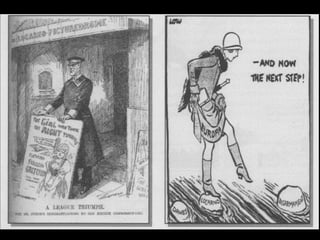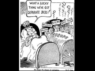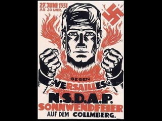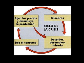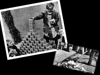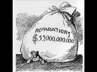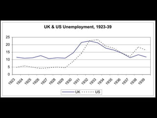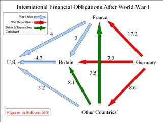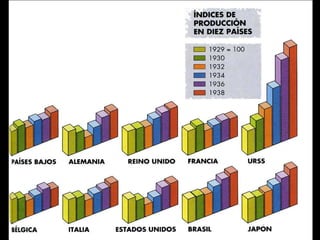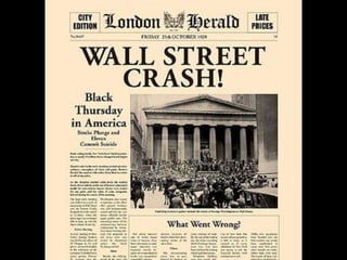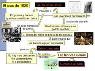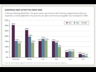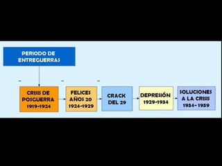 El documento describe el período de entreguerras en Europa, incluyendo la hiperinflación en Alemania después de la Primera Guerra Mundial debido a las grandes reparaciones de guerra, la distensión internacional a mediados de los años 20, y el comienzo de la Gran Depresión después del crac bursátil de 1929 en Estados Unidos.