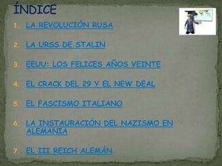 El documento resume el periodo de entreguerras de 1919 a 1939, incluyendo la Revolución Rusa y la creación de la Unión Soviética bajo Stalin, la prosperidad en los Estados Unidos en los años 20 seguida por el Crack del 29 y el New Deal, el ascenso del fascismo en Italia bajo Mussolini y del nazismo en Alemania bajo Hitler, y el aumento de los regímenes totalitarios en Europa durante este periodo.