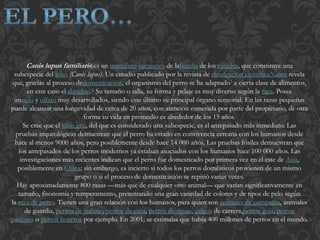 El perro doméstico es un mamífero carnívoro domesticado a partir del lobo gris. Ha estado asociado con los humanos por miles de años y tiene sentidos como el olfato y el oído más desarrollados que los humanos. Existen cientos de razas de perros que varían en tamaño, apariencia y temperamento.