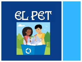 Este documento presenta información sobre el plástico PET (polietileno tereftalato), incluyendo su historia, usos, propiedades y efectos ambientales. Explica que el PET se usa comúnmente para envases de bebidas y otros productos, pero que también tiene impactos negativos como la contaminación de mares, efectos tóxicos a la salud, y que el reciclaje del PET no es tan efectivo. El objetivo es crear conciencia sobre los daños ambientales del uso excesivo de plástico y la necesidad de reducir