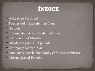 El documento habla sobre el petróleo, incluyendo sus teorías de origen, historia, proceso de extracción, usos principales como fuente de energía, y alternativas sustentables como el biodiesel y bioetanol. También discute los impactos ambientales negativos como la contaminación y el cambio climático, así como las principales regiones productoras de petróleo en el mundo.