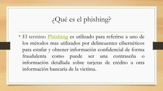 El phishing es un método utilizado por delincuentes cibernéticos para robar información confidencial como contraseñas y detalles de tarjetas de crédito a través de correos electrónicos fraudulentos. Las víctimas deben estar alertas y nunca proporcionar sus datos personales o financieros por correo electrónico, ya que las empresas legítimas no solicitan esa información de esa manera. Siempre se debe verificar la dirección del sitio web que se visita para evitar ser engañado por páginas similares con letras cambi