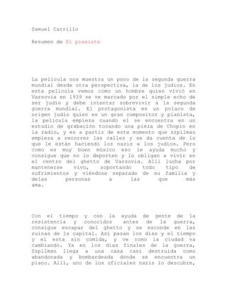 La película El pianista muestra la vida de Wladyslaw Szpilman, un pianista y compositor polaco judío, durante la ocupación nazi de Varsovia en la Segunda Guerra Mundial. Szpilman logra evitar la deportación inicial debido a su talento musical, pero es obligado a vivir en el gueto judío sobrepoblado y sufriendo hambre y separación de su familia. Más tarde escapa del gueto con ayuda de la resistencia y se esconde en las ruinas de la ciudad, sobreviviendo a duras penas. Casi al final