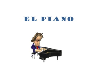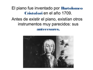 El documento describe la historia del piano, explicando que fue inventado por Bartolomeo Cristofori en 1709 y que tuvo varios antecesores como la cítara, el salterio y el clavicordio. Finalmente presenta al piano como un instrumento de cuerdas percutidas con teclas y pedales, con 88 teclas en total y que existe en dos variantes, el piano de cola y el piano vertical.