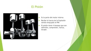 Este documento describe las principales partes de un motor de combustión interna, incluyendo el pistón, bulón, biela, segmentos o anillos, falda del pistón y garganta. El pistón recibe la fuerza de la explosión y se empuja hacia arriba. La biela transmite esta fuerza al cigüeñal. Los segmentos o anillos sellan la cámara de combustión y lubrican el cilindro.
