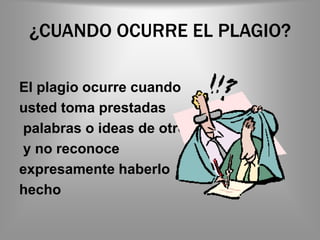El documento habla sobre el plagio, definiéndolo como tomar prestadas palabras o ideas de otros sin reconocer la fuente. Explica cuatro tipos de plagio y cómo evitarlo a través de la citación y parafraseo adecuados.