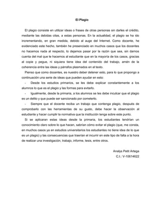 El documento habla sobre el plagio y cómo ha aumentado debido a Internet. Explica que el plagio implica usar ideas o frases de otros sin darles crédito. Propone que desde primaria se debe enseñar a los estudiantes sobre el plagio, que es un delito, y que los profesores deben sancionar el plagio en los trabajos para prevenirlo.