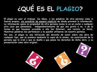 Este documento define el plagio y ofrece consejos sobre cómo evitarlo. Explica que el plagio implica usar el trabajo de otra persona como propio sin dar crédito. Luego, detalla dos formas de evitar el plagio: 1) parafrasear las ideas de otros usando tus propias palabras y 2) citar al autor original cuando uses sus palabras o ideas, ya sea dentro del texto o en una bibliografía al final. Finalmente, enlista algunas razones por las cuales no se debe plagiar, como que impide aprender y desarrollar capacidades propias.