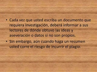 El documento habla sobre el plagio, definido como tomar las palabras o ideas de otros sin reconocerlo expresamente. Explica que las ideas y palabras se consideran propiedad intelectual y no pueden usarse sin permiso. También describe cómo citar correctamente las fuentes y estrategias para parafrasear sin plagiar, como usar sinónimos y cambiar la estructura de la frase.