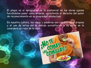 El plagio consiste en apropiarse de las ideas u obras de otros sin darles crédito. Se puede evitar el plagio citando adecuadamente las fuentes y dando crédito a los autores originales de las ideas. El plagio incluye parafrasear pobremente sin cambiar las palabras o frases originales y no incluir referencias bibliográficas.