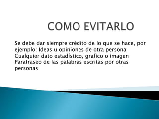 El documento define el plagio como tomar las palabras o ideas de otros sin reconocer su autoría, lo cual es considerado propiedad intelectual. Explica que siempre se debe dar crédito a otras fuentes ya sea citándolas o parafraseándolas. También describe cómo citar correctamente según las reglas APA e identifica qué tipo de información requiere ser citada.