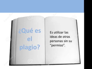 Este documento define el plagio, la citación y la parafraseo, y proporciona estrategias para evitar el plagio. Explica que el plagio implica usar las ideas de otros sin su permiso. La citación requiere indicar expresamente la fuente cuando se toman palabras, ideas o cifras de otra parte. La parafraseo usa las ideas de otra persona en palabras propias, pero aún requiere dar crédito a la fuente original. Para evitar el plagio, se debe referenciar directamente la frase o idea usada o citar al parafrasear.