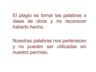 El documento habla sobre el plagio, definido como tomar las palabras o ideas de otros sin reconocer su fuente. Explica que siempre se debe citar e informar la fuente de información ajena utilizada en un documento. También se considera plagio hacer un resumen sin cambiar sustancialmente las palabras originales. El plagio es una falta grave que puede acarrear expulsión. El documento proporciona instrucciones sobre cómo citar fuentes y parafrasear ideas ajenas para evitar el plagio.