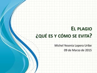 El documento habla sobre qué es el plagio y cómo evitarlo. Define el plagio como no hacer mención de ideas tomadas de otros autores o utilizar los mismos términos del texto original. Explica que para citar se debe dejar claro la fuente de información, mientras que para parafrasear se pueden usar sinónimos u otras estrategias siempre y cuando se comunique la fuente. Concluye que para evitar el plagio se debe dar referencia a cada idea ajena y revisar la información antes de publicarla.