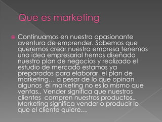 Este documento describe los aspectos fundamentales de un plan de marketing. Explica que el marketing no es lo mismo que las ventas y se enfoca en satisfacer las necesidades de los clientes. Además, detalla que un plan de marketing efectivo debe especificar los productos o servicios, canales de distribución, estrategias de promoción, y precios. Finalmente, enfatiza la importancia de entender muy bien el propio producto o servicio.