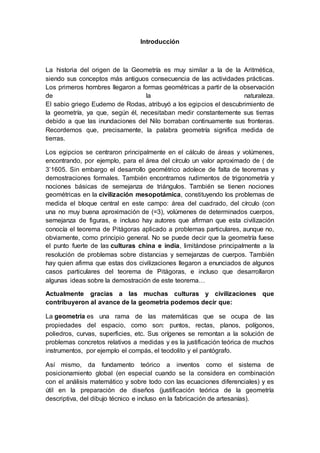 El documento describe los orígenes y desarrollo de la geometría a través de las civilizaciones antiguas como los egipcios y griegos. Explica conceptos geométricos fundamentales como el plano, sus formas de determinación, rectas notables y representación mediante trazas. Finalmente, detalla elementos del plano como área, designación, pertenencia de rectas y planos paralelos.