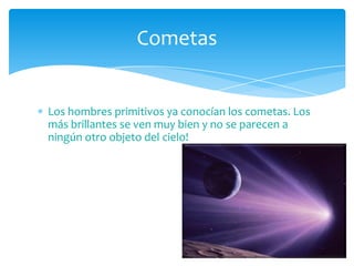 El documento habla sobre tres cometas: el cometa Halley, el cometa Encke y el cometa Rigollet. Explica que el cometa Halley se ve cada 76 años y el cometa Rigollet cada 156 años, mientras que el cometa Encke solo se puede ver cada 3 años y 3 meses con un telescopio debido a su órbita corta. También menciona el cometa Kohouotek, que pasó cerca de la Tierra en 1974.