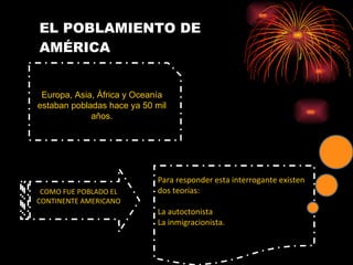 El documento resume tres teorías sobre el poblamiento de América: 1) La teoría autoctonista sugiere que el hombre evolucionó primero en América. 2) La teoría de la ruta de Bering propone que los primeros pobladores llegaron a América del Norte desde Asia a través del estrecho de Bering. 3) La teoría de la ruta del Pacífico argumenta que los primeros pobladores llegaron en embarcaciones desde Oceanía a través del océano Pacífico.