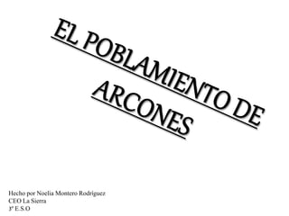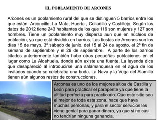 El documento describe el poblamiento rural de Arcones en Castilla y León, el cual consiste en cinco barrios dispersos con una población total de 243 habitantes. Cada barrio tiene características únicas como su tamaño, actividades económicas y grado de población permanente versus casas de vacaciones. Arcones también es popular para practicar parapente debido a su ubicación en las montañas.