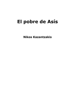 El documento resume la novela "El pobre de Asís" de Nikos Kazantzakis, la cual narra la vida de San Francisco de Asís a través de la perspectiva de su compañero Hermano León. Describe el primer encuentro entre Hermano León y Francisco, donde León era un mendigo hambriento que buscaba a Dios y oyó que Francisco podría darle limosna. León siguió la voz que cantaba bajo una ventana y reconoció a Francisco, sintiendo su santidad.