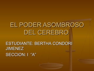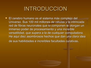 El documento describe algunas de las asombrosas capacidades del cerebro humano. El cerebro puede alterar casi cualquier función del cuerpo a través del pensamiento, reparar el daño causado por un infarto cerebral formando nuevas conexiones neuronales, y supervisar constantemente todo lo que ocurre en el cuerpo. El cerebro también tiene más conexiones que átomos en el universo conocido y genera hormonas que fortalecen el vínculo entre madres e hijos durante el parto.
