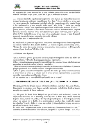 El documento habla sobre la importancia y los beneficios del ayuno. Explica que el ayuno es un mandato de Dios que trae libertad espiritual y rompe las ataduras del enemigo. También describe diferentes tipos de ayuno y ejemplos bíblicos como el ayuno de Jesús, Ester y Nehemías. El objetivo principal del ayuno es fortalecer la vida espiritual a través de la humildad, la oración y el arrepentimiento.