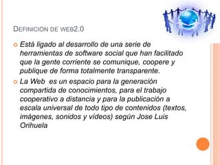 La Web2.0 se define como el desarrollo de herramientas que facilitan la comunicación y colaboración entre personas para generar y compartir conocimiento de forma transparente. Ofrece beneficios como estimular la alfabetización y permitir estudiar y trabajar sin importar la distancia. Se diferencia de la Web1.0 en que la información es descentralizada, diversa y actualizada constantemente por los usuarios usando software gratuito y flexible. Algunas aplicaciones populares de la Web2.0 incluyen blogs, wikis y redes sociales.