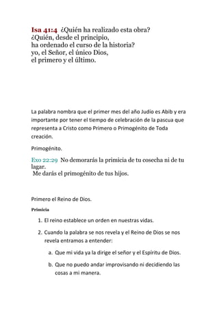 Este documento habla sobre la importancia de poner a Dios primero en todas las áreas de la vida. Explica conceptos bíblicos como las primicias, diezmos y primogenitura, y cómo reconocer a Dios como el dueño de todo a través de estos actos. También describe cuatro principios clave: 1) todo funciona cuando Dios es primero, 2) las primicias traen honra al Rey, 3) el diezmo reconoce a Dios como dueño de las finanzas, y 4) la unción del primogénito representa autor
