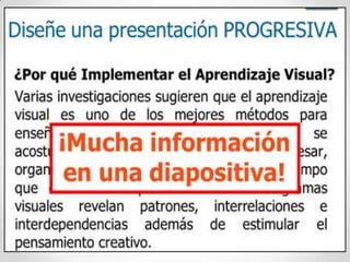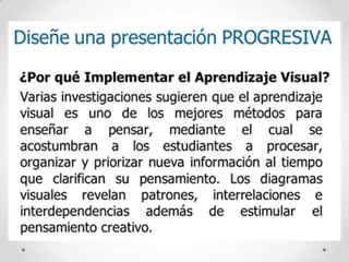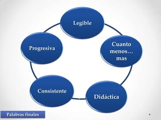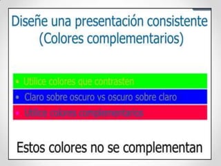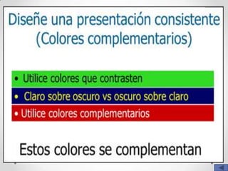 Este documento ofrece consejos para el diseño de presentaciones efectivas en PowerPoint. Recomienda mantener las diapositivas sencillas con pocos elementos, usar fuentes grandes y legibles, incluir diagramas visuales para organizar la información, y mantener un diseño consistente en toda la presentación para facilitar la comprensión del público.