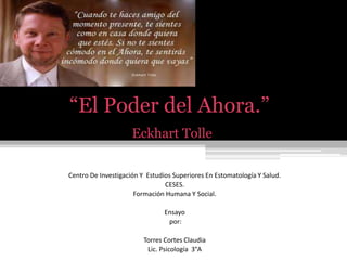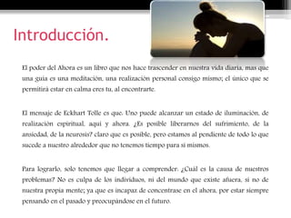 El documento resume el libro "El Poder del Ahora" de Eckhart Tolle. Explica que el libro enseña que es posible alcanzar la iluminación y liberarse del sufrimiento viviendo completamente en el presente, ya que la mente suele estar atrapada en el pasado o el futuro. También describe cómo la mayoría de nuestros problemas son causados por nuestra propia mente al identificarse con los pensamientos en lugar de vivir en el ahora, y cómo es posible alcanzar la paz interior a través de la meditación y aceptación del momento