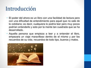 El resumen describe un documento que analiza el libro "El poder del ahora" de Eckhart Tolle. Explica que el libro enseña sobre la importancia de vivir en el presente en lugar de preocuparse por el pasado o el futuro. Además, enseña a aceptar el pasado doloroso para poder disfrutar el ahora y no dejar que los miedos del pasado limiten el presente. Finalmente, recomienda aprender a observar el presente de manera consciente para poder experimentar el verdadero poder del momento actual.