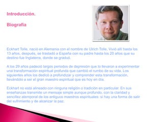 Este documento resume el Capítulo 2 del libro "El poder del ahora" de Eckhart Tolle. Explica que el miedo psicológico surge de pensar en posibles eventos futuros en lugar de vivir en el presente. También describe cómo el ego es vulnerable y defiende una identidad ilusoria a través de mecanismos como discusiones y juegos de poder. Además, señala que vivir identificado con la mente atrapa en el tiempo, causando preocupación por el pasado y futuro en lugar de honrar el momento presente.