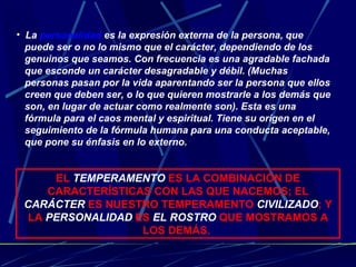 El documento describe las diferencias entre el temperamento, el carácter y la personalidad. Explica que el temperamento son las características con las que nacemos, el carácter es nuestro temperamento modificado por la educación, y la personalidad es cómo nos mostramos a los demás. Además, identifica cuatro temperamentos principales (sanguíneo, colérico, melancólico y flemático) y describe sus fortalezas y debilidades.