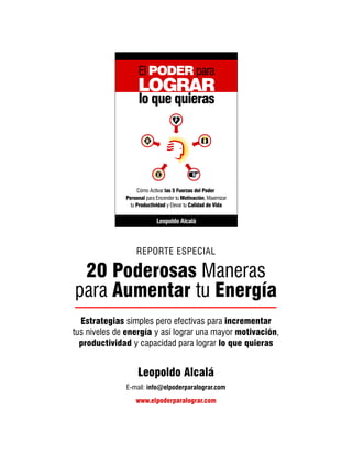 Este documento presenta estrategias para aumentar los niveles de energía a través de 20 maneras poderosas. El autor, Leopoldo Alcalá, es un conferencista y empresario venezolano que ha diseñado talleres sobre desarrollo personal, motivación y éxito. El documento incluye consejos como conectarse con el propósito, enfocarse en las metas deseadas, encontrar acciones pequeñas que se pueden lograr, y adoptar pensamientos y hábitos energizantes.