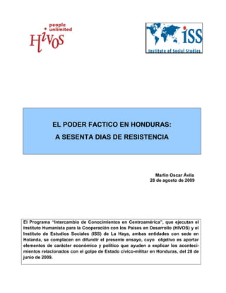 1. El documento describe la historia de golpes de estado y regímenes militares en Honduras desde el siglo XX, los cuales han dominado el poder político por casi la mitad del tiempo. 2. Explica el período democrático formal desde 1982 y el creciente poder de los empresarios sobre el Estado y la política. 3. Analiza los motivos del golpe de estado de 2009 como un intento de la élite económica y política de mantener su dominio frente a un gobierno más popular.