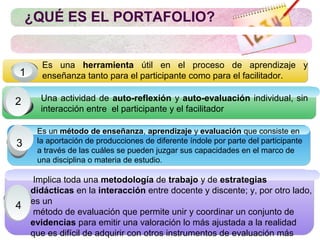 El documento define el portafolio como una herramienta de auto-reflexión y evaluación individual que permite juzgar las capacidades de un estudiante a través de producciones. Un portafolio reflexivo ofrece información amplia sobre el aprendizaje a través de la evaluación continua y la cooperación entre estudiantes y profesores. El proceso de elaboración de un portafolio implica la recopilación, selección y reflexión sobre evidencias del aprendizaje organizadas según criterios de evaluación.