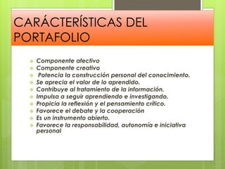 El portafolio es un conjunto de herramientas y prácticas diseñadas para que los profesores obtengan información sobre la calidad del aprendizaje de los estudiantes y faciliten el diálogo entre estudiantes y profesores sobre el proceso de aprendizaje y cómo mejorarlo. Los portafolios tienen varios tipos y características como favorecer la construcción del conocimiento, la reflexión crítica y la cooperación; también se usan para la evaluación y desarrollo profesional docente así como para involucrar a los padres.