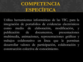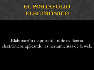 Este documento describe el portafolio electrónico y su uso para evaluar el aprendizaje. Explica que un portafolio electrónico permite a los estudiantes recopilar evidencia de su trabajo y progreso a través del tiempo usando herramientas digitales. Detalla los tipos de portafolios, sus propósitos, elementos, ventajas y desventajas. El portafolio electrónico promueve la autonomía del estudiante y una evaluación continua y formativa.