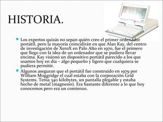 El documento resume la historia del ordenador portátil desde las primeras ideas en la década de 1970 hasta su desarrollo en los años 1980. Explica que Alan Kay propuso originalmente la idea de un ordenador portátil pequeño y ligero en 1970, y que el primer portátil real fue creado por IBM en 1986. También destaca las ventajas de la movilidad que ofrecen los ordenadores portátiles.