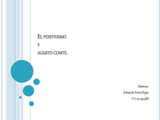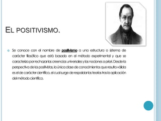 El documento resume las ideas principales de Augusto Comte sobre el positivismo. Comte consideró que el conocimiento válido se basa únicamente en los hechos establecidos por la observación y la experiencia. Propuso que la sociedad y las ciencias pasan por tres estadios: teológico, metafísico y positivo. También desarrolló el método sociológico de comparar sociedades a través del tiempo para descubrir leyes.