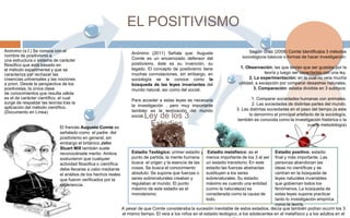 Este documento describe las ideas centrales del positivismo según Augusto Comte. Comte propuso que hay tres estadios en el desarrollo del conocimiento humano: el teológico, el metafísico y el positivo. El estadio positivo, en el que se basa el positivismo, se centra en la búsqueda de leyes naturales invariables a través de la investigación empírica y la teoría. Comte también propuso que la fórmula del positivismo es el amor como principio, el orden como base y el progreso como fin