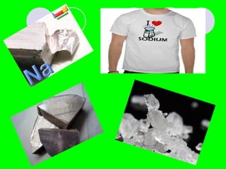 Este documento trata sobre el sodio y el potasio. Explica que el sodio es un metal alcalino blando y abundante encontrado en la sal marina. Sus principales usos son en síntesis orgánica, fabricación de desodorantes, purificación de metales y fabricación de células solares. Sus compuestos más importantes son la sal común, el carbonato de sodio y la sosa cáustica. Luego, describe que el potasio es un metal alcalino blanco-plateado esencial que se obtiene de minerales y sus usos