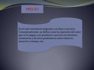 Este documento trata sobre el tema del precio en marketing. Explica que el precio es la expresión monetaria del valor de un bien o servicio y que en el mercado libre se fija mediante la oferta y la demanda. También describe algunos métodos para fijar precios como determinar los objetivos de fijación de precios, analizar la demanda y elasticidad de precios, y seleccionar entre métodos como fijación por sobreprecio o por tasa vigente. Además, explica que un precio debe permitir cumplir objetivos financieros de la