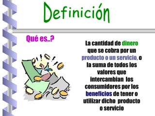 El documento describe los diferentes factores y enfoques que deben considerarse al determinar los precios de productos y servicios. Entre los factores internos se encuentran los objetivos de mercadeo y costos de la empresa, mientras que los factores externos incluyen la demanda del mercado y la competencia. Los enfoques para fijar precios pueden basarse en los costos, el valor percibido por los clientes, los precios de la competencia, o la demanda del mercado. Al determinar precios para servicios se deben considerar aspectos como los costos monetarios y