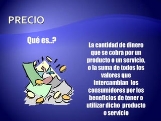 Este documento define el precio como la cantidad de dinero que se cobra por un producto o servicio. Explica que existen diferentes factores y modelos para fijar precios, como el mercado, la competencia, los objetivos de la empresa, la demanda y los costos. También describe métodos para determinar precios como los basados en el mercado, costos o margen deseado.